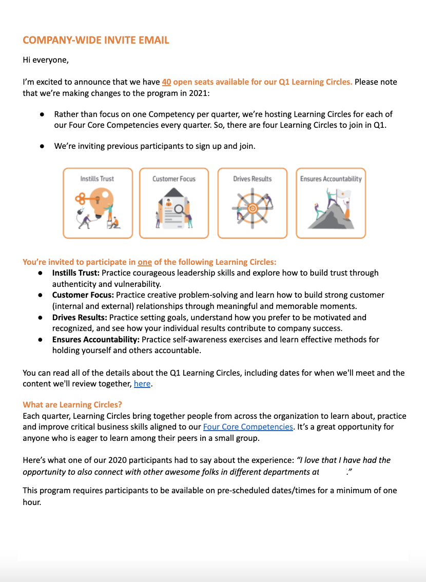 I developed a company-wide in-person and virtual training program that leveraged peer-to-peer learning and a cohort-based structure. Content focused on the company’s core values to help build an active and intentional culture.