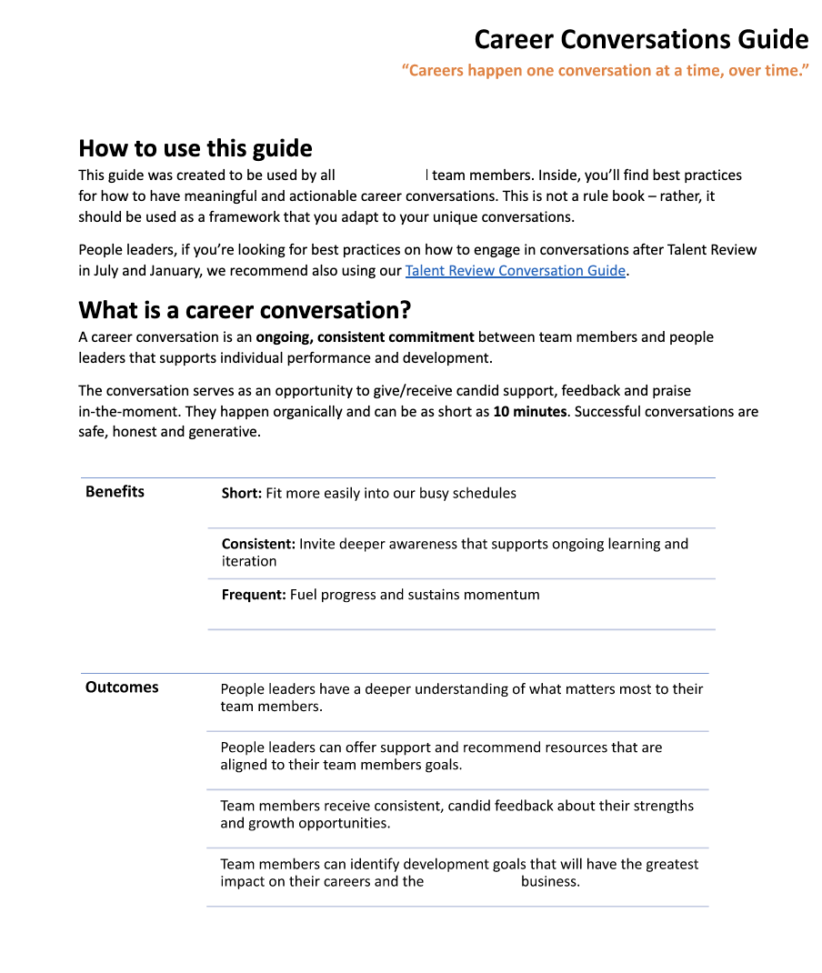 I built a company-wide career development program, the first of its kind at the organization. The program included an intranet site, conversation guide, self-discovery workbook, personal development plan, and goal setting framework.